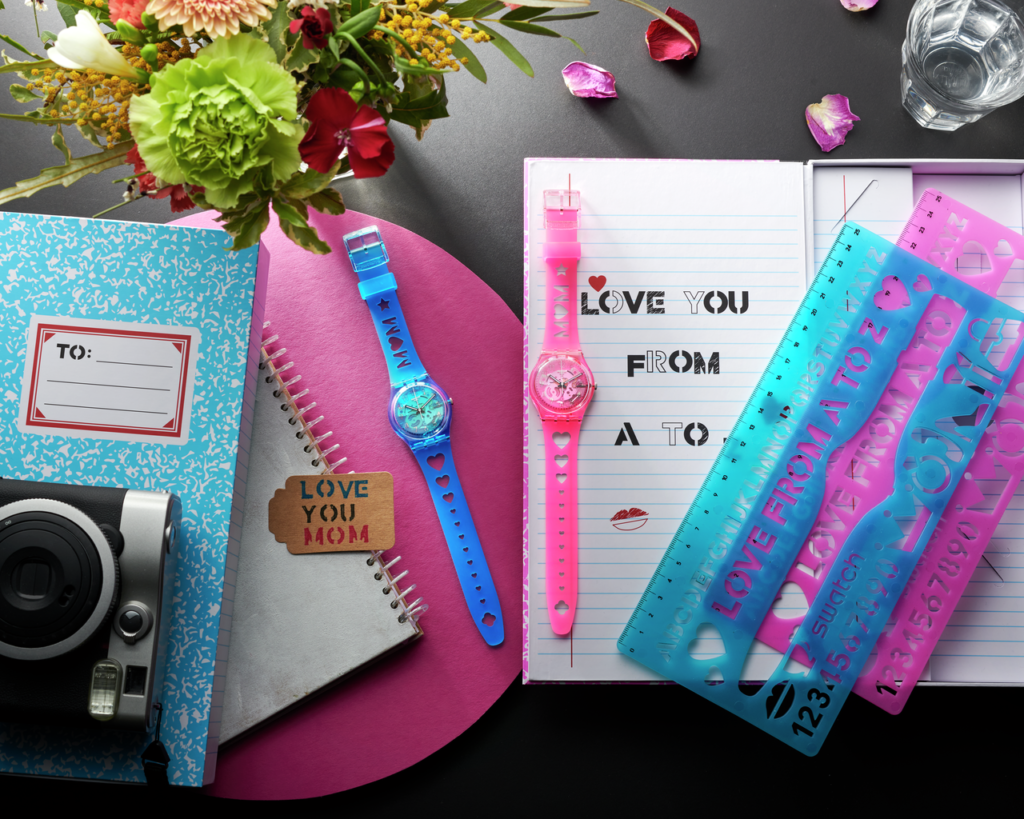 Du temps, c’est bien ce que toutes les mamans ont du mal à trouver. Plein de fantaisie, ce cadeau sort de l’ordinaire. Ces montres vives et colorées rappellent l’esprit écolier et évoque les souvenirs des heures consacrées aux devoirs. Jusqu’au dernier détail, ces montres représentent le parfait cadeau pour la Fête des mères. Une jolie inscription « Mom » ainsi que des petits cœurs découpés à l’emporte-pièce stylisent le bracelet et lui donnent un petit charme rétro.