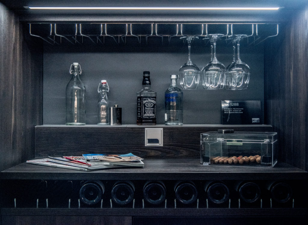 Nous jetons un coup d’oeil autour de nous. Une partie des invités se tient sur le balcon surplombant l’Areuse et profite de prendre l’air. Une autre partie, toujours affairée à contempler les cuisines et le mobilier présentés, est éparpillée dans le showroom. Nous remarquons alors un homme qui se tient devant un meuble que nous n’avions pas encore vu. Nous nous approchons. « C’est le meuble de rangement de luxe personnalisé +STAGE de la marque Poggenpohl », nous souffle-t-il, « magnifique, non ? ». C’est le cas. Le meuble, à l’aspect viril et luxueux, dit tout de sa praticité, sans pour autant révéler ses secrets au premier abord. Doté de nombreux rangements aux finitions parfaites, nous l’imaginons sans peine trônant dans un salon, proche de l’espace bar.
