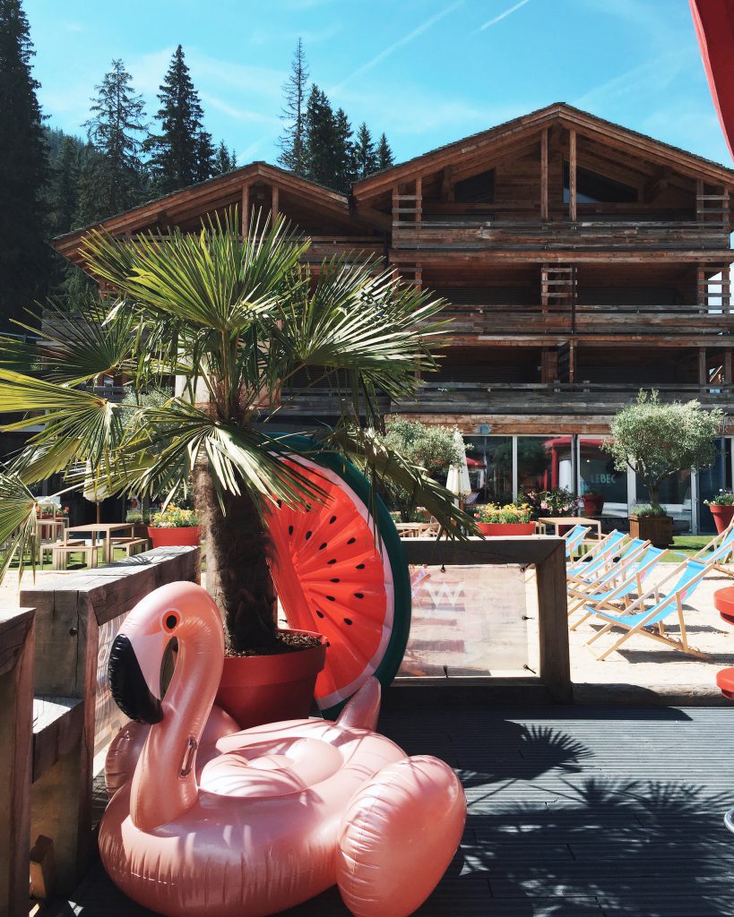Pour une rapide escapade sur le sable cet été, sortez des sentiers battus, repensez la plage et les étendues de sable et partez… à la montagne ! Car oui, la plage la plus cool de 2017 se trouve à 1500m d’altitude, à Verbier ! C’est la W Verbier Beach, la plage de l’hôtel 5* éponyme. Certes, de prime abord, le contraste visuel a de quoi surprendre : des palmiers et des oliviers d’un côté, des chalets rustiques et des montagnes de l’autre. Il fallait oser ! Pourtant le cocktail fonctionne. Le temps d’une après-midi farniente à siroter des breuvages sur un transat avec les pieds en éventails sur le sable chaud, on ne fait plus la différence entre un « biker » casqué qui dévale la montagne en vélo et un surfeur bronzé sur une plage de l’Atlantique. Respirez, fermez les yeux, profitez … vous êtes à la mer !