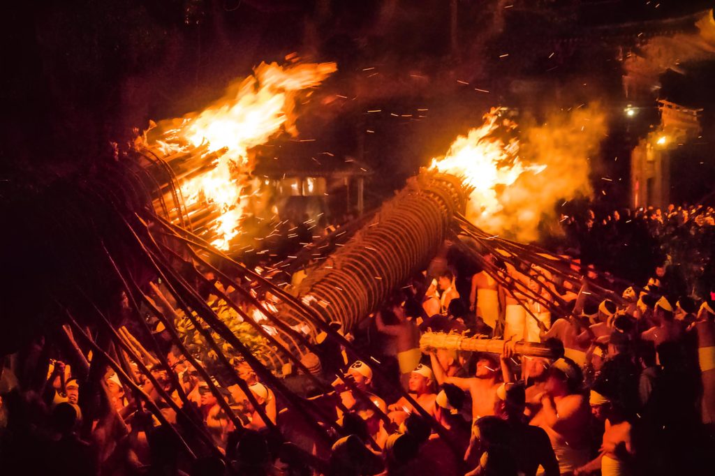 Sur l’île de Kyushu, à Kurume (préfecture de Fukuoka), le festival du feu Oniyo met en scène l’élément feu sous sa forme la plus spectaculaire. D’immenses torches de bambou, pouvant atteindre 13 mètres de haut et peser 1,2 tonne, sont portées dans les rues pendant des heures. Étincelles, chaleur, fumée et éclairs de lumière créent un tourbillon sensoriel qui symbolise la mise à distance des soucis du quotidien.