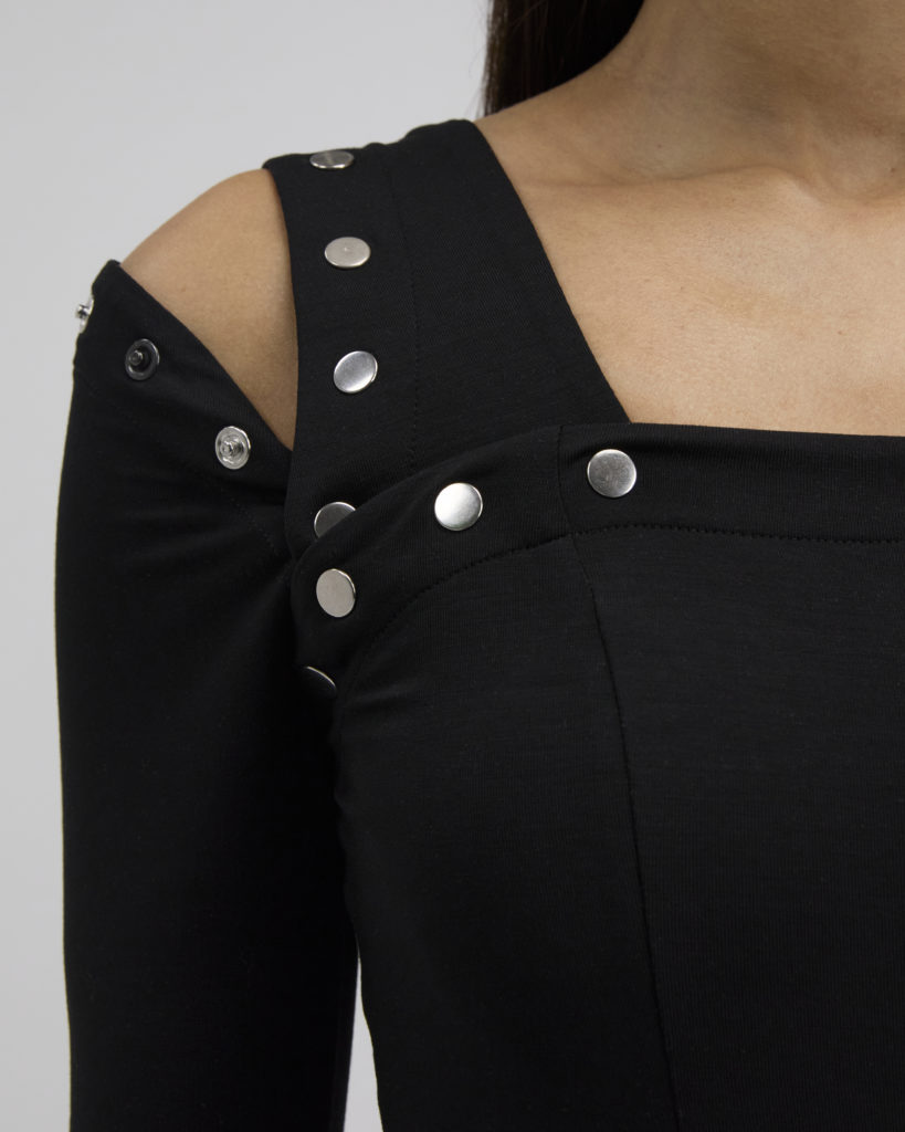 Fabriquée avec 96% de fibres de bois et 4% d’élasthanne, les pièces font ensuite appel à l’imagination de celle qui les porte. Tout cela est rendu possible par des boutons à pression. Il ne reste alors plus qu’à clipper les vêtements au gré de ses envies.