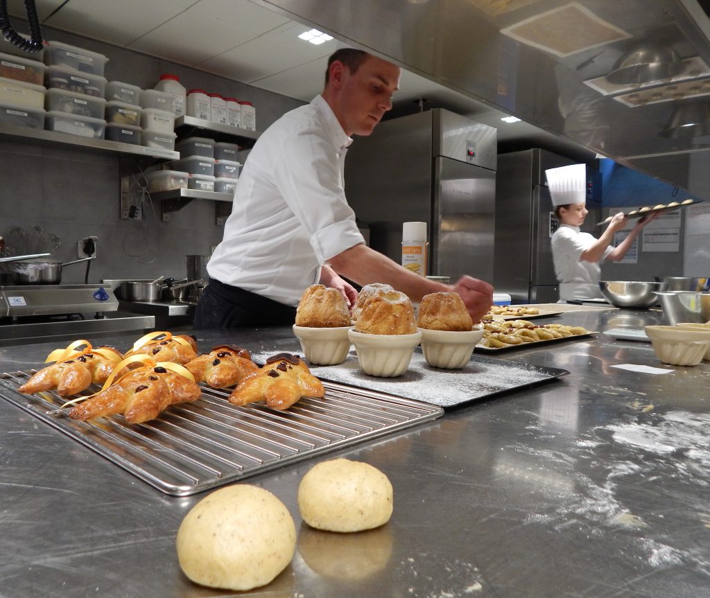 Sur le long plan de travail en inox, les ingrédients sont déjà là, bien arrangés dans leurs culs de poule : de la farine, de la levure, des œufs, du sel, etc. A priori rien de bien difficile, mais la brigade de pâtissiers qui s’active autour de nous pour terminer les macarons, cookies et autres tartelettes au citron nous met un tout petit peu la pression ! Leurs gestes sont évidemment assurés, précis et efficaces … le parfait inverse de nos tentatives désespérées de faire un bonhomme en brioche !