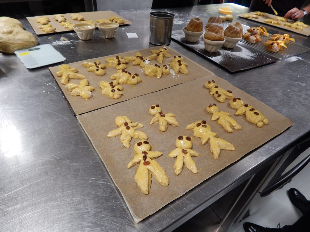 Après plusieurs tentatives et grâce aux conseils avisés de Laurent Schmitt, nous réussissons tant bien que mal à créer quelques « grittibänz » approximatifs, que nous décorons maintenant de jaunes d’œuf et de raisins au rhum. Trent minutes plus tard, la pâte a suffisamment levé et nous passons à la cuisson. Le temps d’un café, nos bonhommes de la St Nicolas sortent du four, tous chauds et prêts à être dégustés, sans aucun état d’âme pour leur design imparfait ! Au fond, les seuls qui ont paru surpris de notre autosatisfaction … ce sont les vrais pros de la pâtisserie du Royal Savoy, mais ils ont eu la décence de ne rien laisser transparaitre !