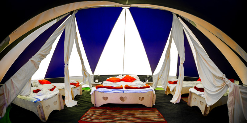 Une ambiance camping, le confort en plus! De la maisonnette multicolore en bois pour 2 à la tente façon yourte accueillante pour 8, du confort le plus rustique au vrai matelas, mille options s’offrent à vous.