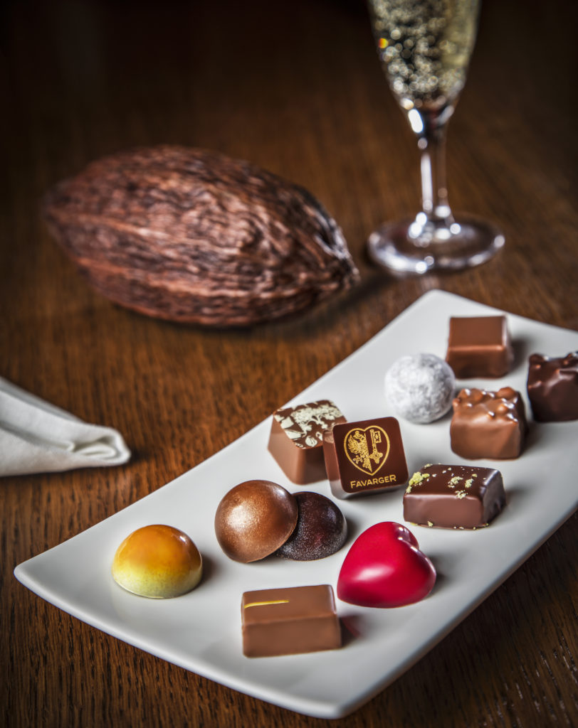 Situé au sein de la boutique du 19 quai des Bergues, récemment réouverte suite aux travaux de rénovation du quartier, le Bar à Chocolats est une invitation au voyage, à la découverte de ce que le chocolat suisse peut offrir de meilleur : une véritable immersion gourmande et sensuelle à travers près de deux siècles de savoir-faire chocolatier. On s’y régale des créations artisanales de la marque, qui offrent une étonnante palette de formes, de couleurs, de textures, de saveurs, riches de sensations et d’émotions fortes. Tables hautes en bois brut, élégants tabourets de bar, lumière tamisée, musique jazzy en fond, l’écrin cosy propose à la dégustation, ganaches en forme de coeur, dômes aux couleurs assorties, pralinés fondants ou croustillants ou encore chocolats noirs de grandes origines à choisir à la carte. Installé sur son tabouret dans un cadre rétro-chic fidèle à l’ADN de la maison Favarger, on sirote son ristretto en savourant sa sélection personnalisée. Le luxe du sur-mesure pour une expérience unique. Au menu ? De la haute chocolaterie 100 % suisse, pour connaisseurs comme pour amateurs, qu’ils soient genevois ou de passage dans la cité de Calvin. Grands classiques ou créations chocolatés des plus originales, l’ensemble de l’assortiment est confectionné dans l’atelier de Versoix en exclusivité pour le bar.