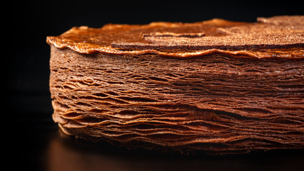 Loin de la galette classique, « Curve of Time » se présente comme une relecture contemporaine d’un rituel profondément ancré dans la tradition française du début d’année. Nina Métayer imagine une pâte feuilletée cacaotée renfermant une généreuse frangipane à la châtaigne, relevée de délicates notes de noisette pour une dégustation riche et stratifiée. De la pâte feuilletée infusée au cacao à la crème de châtaigne, en passant par un praliné noisette aux éclats et une fine tuile de cacao aux reflets dorés, chaque couche est travaillée avec une précision presque architecturale.