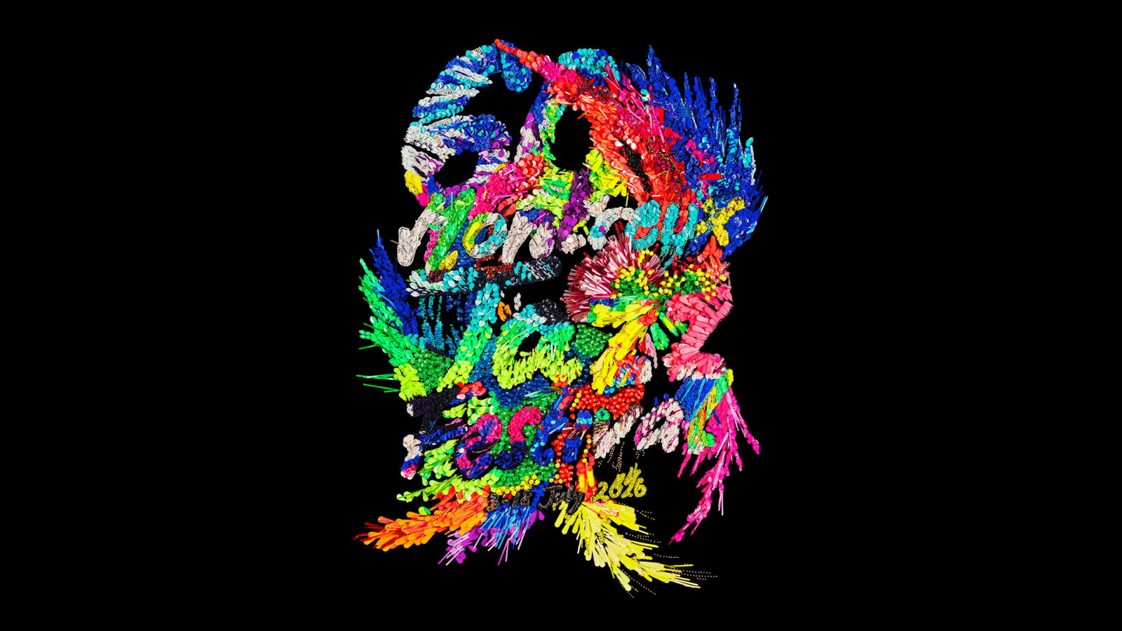 Germanier, installé à Paris et figure montante de la mode responsable, a conçu une œuvre foisonnante composée de plus de 60 000 perles et sequins en verre, bois ou plastique, tous issus de matériaux recyclés. Brodés à la main sur une toile de velours noir, ces éléments forment une sorte de constellation vibrante, entre chaos organisé et précision extrême. Six personnes ont travaillé simultanément sur la broderie pour obtenir cet effet en trois dimensions, proche de ses pièces haute couture.