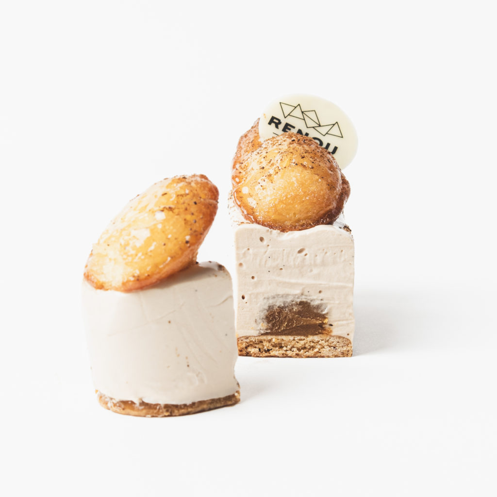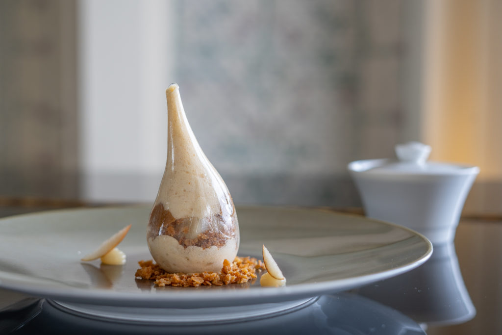 L’Aparté, au sein de l’Hôtel Royal, devient le théâtre de la créativité de Nathanel Guigui, qui livre une composition audacieuse : biscuit madeleine au citron, crème pralinée, riz au lait, sucette vanillée au riz soufflé et barbe à papa. Ce dessert, surmonté d’une touche glacée inspirée du mille-feuille de son père, est un vibrant hommage aux goûters familiaux.