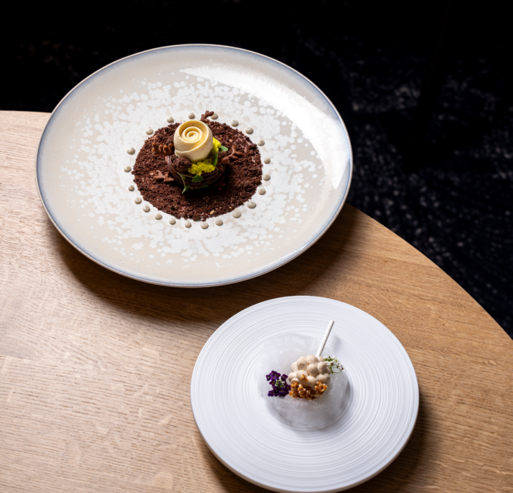L’Aparté, au sein de l’Hôtel Royal, devient le théâtre de la créativité de Nathanel Guigui, qui livre une composition audacieuse : biscuit madeleine au citron, crème pralinée, riz au lait, sucette vanillée au riz soufflé et barbe à papa. Ce dessert, surmonté d’une touche glacée inspirée du mille-feuille de son père, est un vibrant hommage aux goûters familiaux.