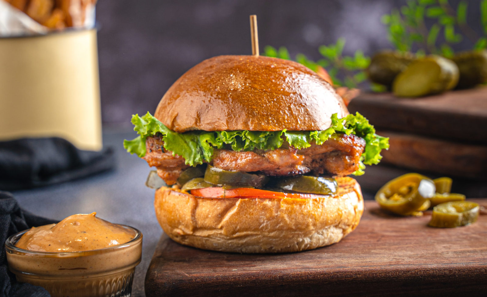 Pour ce burger, j’ai choisi de puiser dans les origines mêmes de cette chaîne de burgers fictive imaginée par Tarantino. On part donc sur une influence hawaïenne tout en y ajoutant notre grain de sel de Bex. Un burger de porc « Kalua », accompagné d’ananas rôti, de belles feuilles de laitue et d’une tranche de tomate juteuse.
