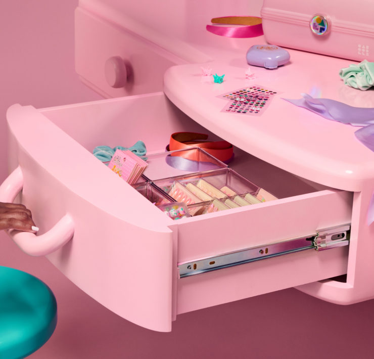 - Se pomponner devant la coiffeuse de Polly Pocket, remplie d’accessoires vintage pour les cheveux et les ongles arborant ses couleurs préférées. Qui veut des faux-ongles ?