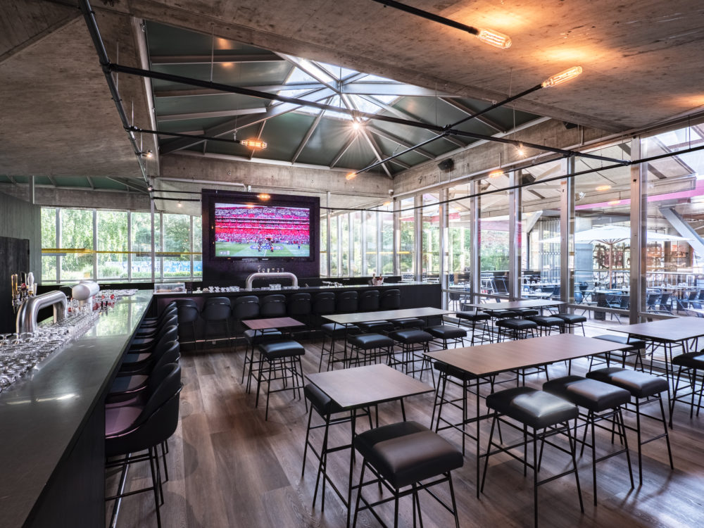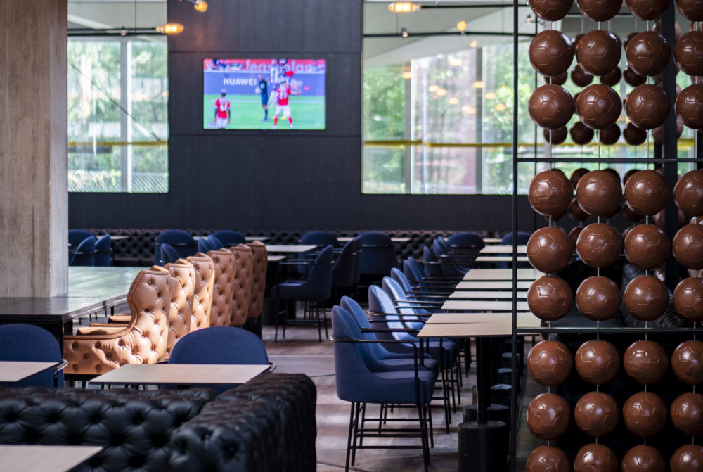 Ultracontemporain, l’agencement du tout nouveau sports bar s’inspire des codes du design factory, avec une touche « Shabby chic » et pour principaux matériaux le béton, le bois, le métal et le cuir. La volonté des designers ? Adopter une structure formée d’éléments en béton en damier pour insuffler un vent de modernité, tout en préservant l’âme des lieux. « C’est un projet où tout a été conçu sur-mesure dans un esprit industriel mêlant l’esthétique à l’image du bâtiment où tous les sports sont mis à l’honneur avec une touche un peu décalée », décrivent Claudio et Fabio Colucci.