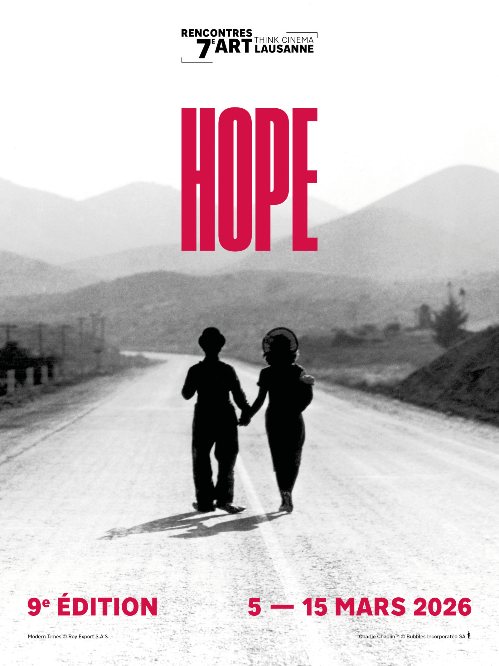 Pour incarner ce thème, les Rencontres 7e Art Lausanne ont choisi une image iconique : le plan final des Temps modernes de Charlie Chaplin. On y voit Charlot et sa compagne s’éloigner vers l’horizon, dos à la caméra, après une série d’épreuves aussi burlesques que cruelles. Ce simple mouvement vers l’avant, au milieu de l’incertitude, condense la promesse du festival : même lorsque tout vacille, une forme d’espoir demeure au bout du chemin.