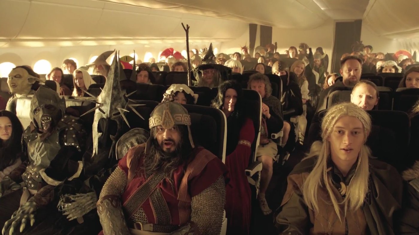 La compagnie aérienne new zélandaise s’est vite prise au jeu en proposant régulièrement des vidéos humoristiques et fantaisistes. La dernière en date parodie les « Men in black ». En 2012, Air New Zealand propose à ses voyageurs un clip inspiré de l’univers Tolkien et des adaptations de Peter Jackson. Ce dernier ainsi que l’acteur Elijah wood (Frodon) y font même une apparition. Grâce au succès de cette première vidéo qui a atteint plus de 11,8 millions de vues, ils ont remis le couvert en 2014 à l’occasion de la sortie du 3e volet des aventures de Bilbon le Hobbit. Le film est intitulé « La plus incroyable vidéo de consignes de sécurité jamais faite »… et nous ne pouvons pas dire le contraire.