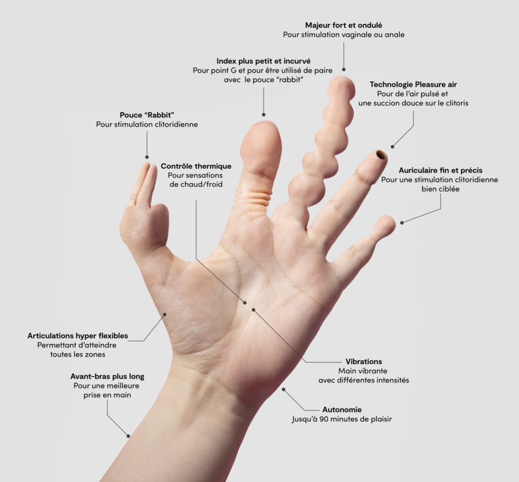 Ces deux mains imaginées par Lovehoney montrent le large éventail de produits qui sont maintenant disponibles sur le marché du bien-être sexuel, ainsi que les différents types de technologie associés. Qu’il s’agisse de doigts supplémentaires ou d’une texture de peau différente pour stimuler le pénis, ou de doigts en forme d’oreilles de lapin pour imiter le fameux sextoy « rabbit » et de la technologie « Pleasure Air » inventée par Womanizer pour stimuler la vulve, il est certain que notre main devrait évoluer de façon spectaculaire pour arriver à nous offrir la même quantité de plaisir que nos jouets sexuels préférés.