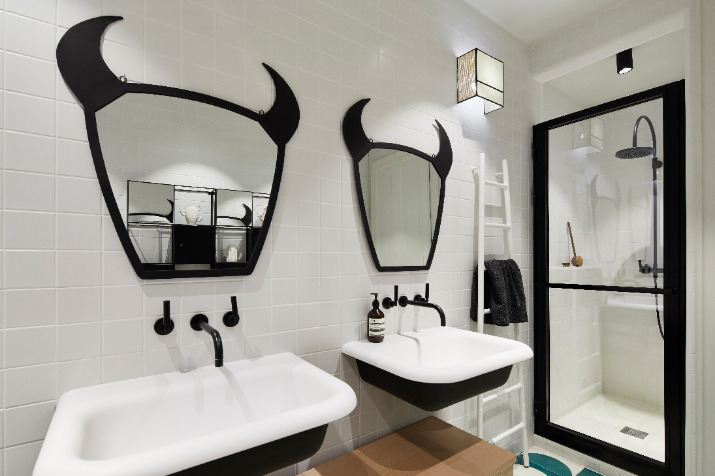 Enfin, la salle de bains des enfants, au design intemporel avec son sol bicolore bleu et son total look noir et blanc, s’autorise la facétie avec les deux miroirs aux allures de taureau pour un coup de frais et de bonne humeur.