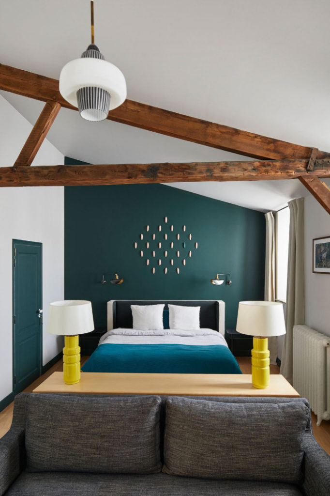 Les différentes chambres, refuges paisibles et tranquilles, sont déclinées en fonction des besoins des occupants. La suite parentale se distingue par sa poutre apparente et son mur vert forêt, éléments qui apportent beaucoup de profondeur et distinction à l’espace.