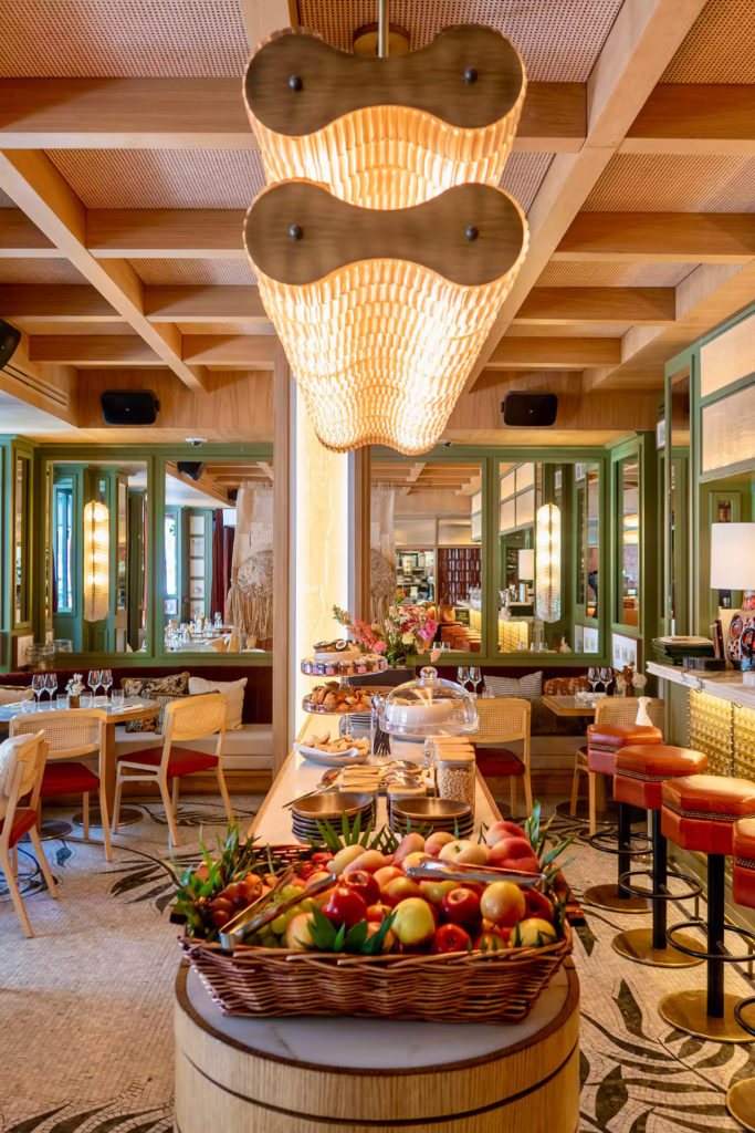 Au-delà de l’assiette, Vesper entend incarner un certain lifestyle. Le communiqué insiste sur l’atmosphère feutrée et chaleureuse : banquettes en velours, lumières tamisées, bar spectaculaire où l’on voit travailler l’équipe en cuisine, comme le montrent les photos de la page 2. Le décor, signé par le studio de l’architecte d’intérieur Lázaro Rosa-Violán, mélange codes tokyoïtes et esprit club chic, avec palmiers, néons et détails graphiques qui rappellent autant les rooftops de Shibuya que les adresses pointues de Soho.